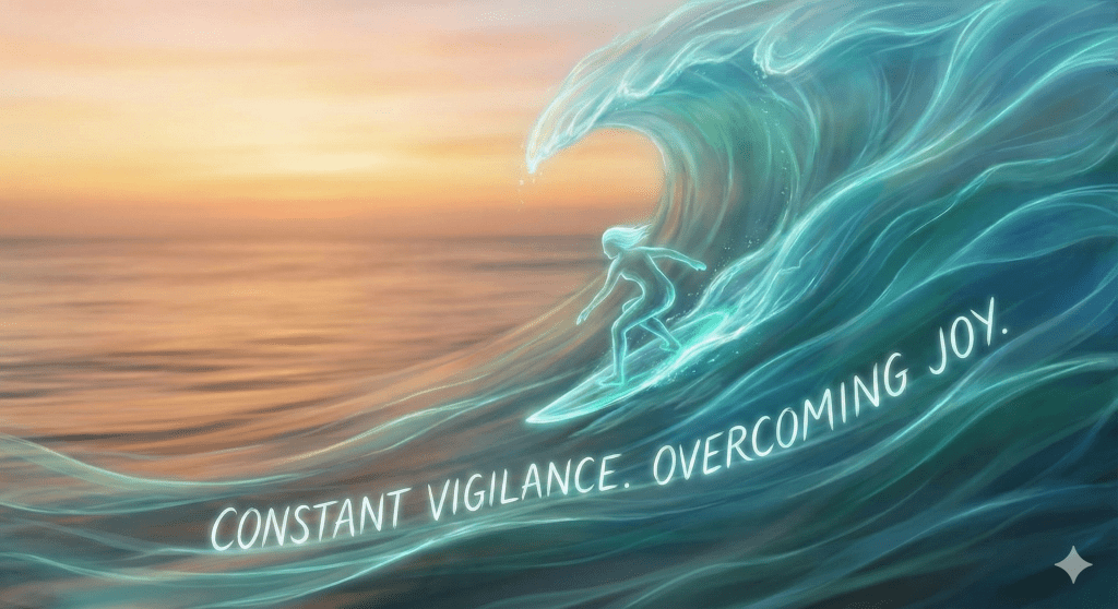 It simply comes in waves that require our constant vigilance. It sounds like surfing! The more practiced you are at riding the wave, the more joy you derive from overcoming even the strongest waves.