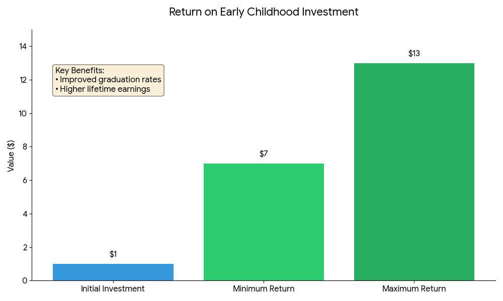 Many studies show that high-quality early childhood education programs return between $7 and $13 for every dollar spent. Some estimates go as high as $17 per dollar, depending on the program and who it serves.